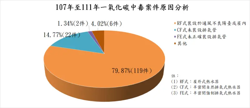 今(2023)年截至11月21日止共發生17件一氧化碳中毒事故,造成3人死亡、43人送醫。而2018至2022年共發生149件一氧化碳中毒案件,造成24人死亡、436人送醫,分析原因,超過95%都是熱水器安裝不良,當中又以「屋外式熱水器安裝在通風不良場所」比例最高。