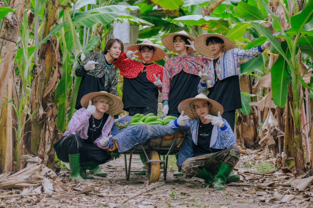 ▲《Ozone夏日青春冒險》煥鈞(後排左起)、哲言、佳辰、文廷、祖安(前排左起)、子翔體驗一日蕉農。(圖:寬想國際娛樂)