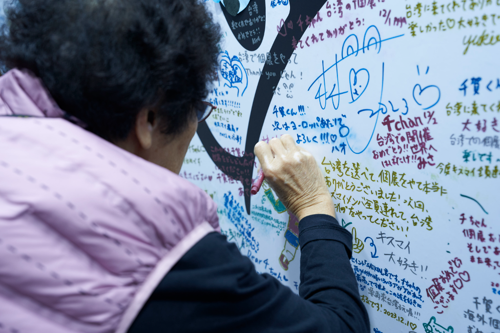 千賀健永將個展搬來台北,展現有別於偶像的藝術創作天份,師弟「Travis Japan」七五三掛龍也、川島如惠留、宮近海斗等三位成員當天往返東京台北力挺師兄,粉絲們把握只有十天的機會到現場以及購買限量商品,並在簽名板上留下想對他說的話,千賀健永表示真的相當感動。