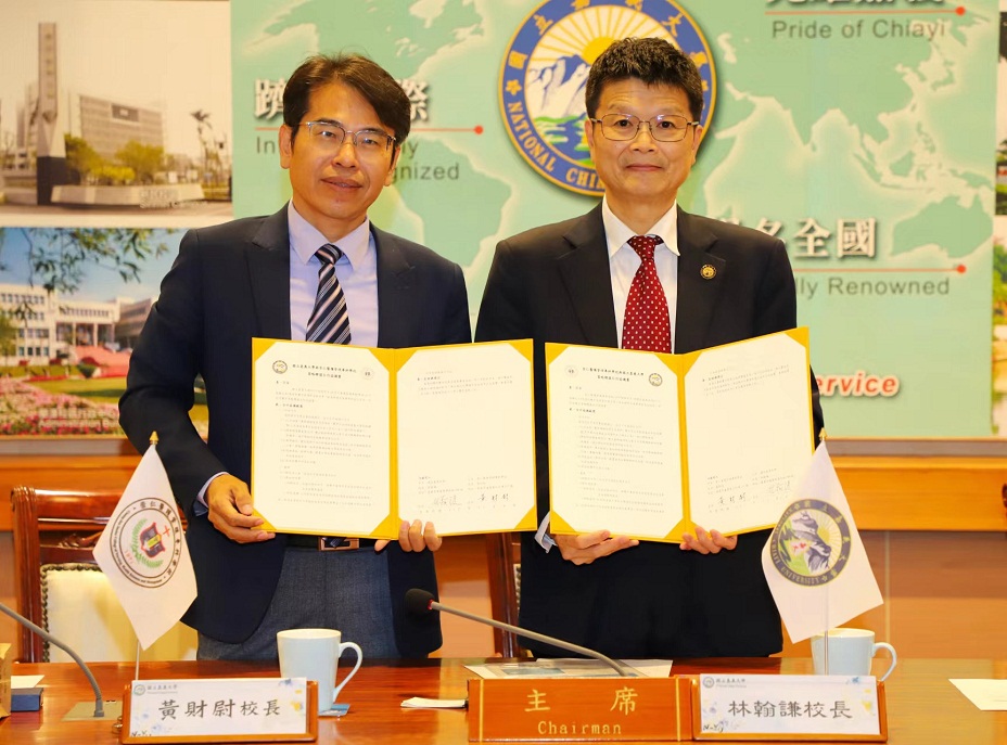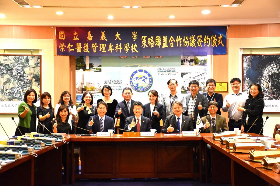 【記者 吳瑞興/嘉義縣 報導】崇仁醫護管理專科學校擴大與鄰近大專校院國立嘉義大學締結教學聯盟與產研合作,昨日在國立嘉義大學舉行策略聯盟合作協議簽約儀式,崇仁醫專由黃財尉校長率領教務處主任黃莉萍博士、技術合作處主任吳寳觀博士以及各科科主任等校內一級主管與會;嘉大由林翰謙校長、陳瑞祥副校長及張俊賢副校長等一級主管出席,共同見證策略聯盟合作簽約儀式。