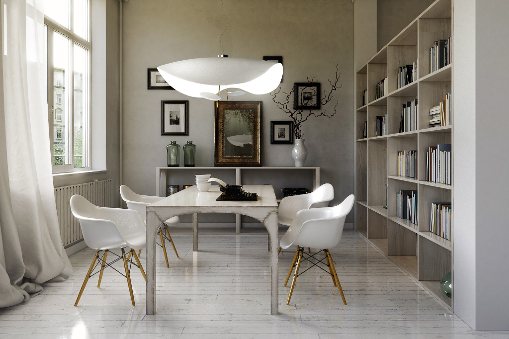 吊燈顧名思義是從天花板向下照明,一般常用於客廳、餐廳等公共空間。不同於水晶吊燈較為華麗的感受,吊燈的設計相對簡約且具現代感。吊燈通常以鐵線、鏈、管懸吊於天花,搭配各式造型的燈罩,在照亮環境的同時,也具有美觀的作用。尤其像歐斯堤照明OSTI Lighting推出的這款織帶吊燈,類似彩帶的樣貌為客廳帶來俏皮活潑的感受。在選擇吊燈前,可以先確認天花的高度和是否能承受燈具的重量,避免天花無法承重與吊燈高度造成視覺產生壓迫感的問題。