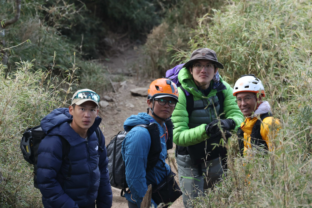 《赤心巔峰》(左起)周青、登山家張元植、編劇雪羊、古明政實地場勘恐龍塔。(圖:活水文化事業有限公司)