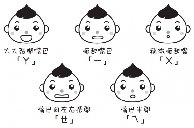 此外,必須與舌頭運動及吐氣練習同時進行的,是讓孩子記住發音基礎,也就是韻母(ㄧ、ㄨ、ㄩ、ㄚ、ㄛ、ㄝ、ㄟ、ㄞ、ㄠ、ㄡ、ㄢ、ㄤ、ㄣ、ㄥ、ㄦ)的發音嘴型。請媽媽務必張大嘴巴發音,讓孩子模仿您的嘴型。