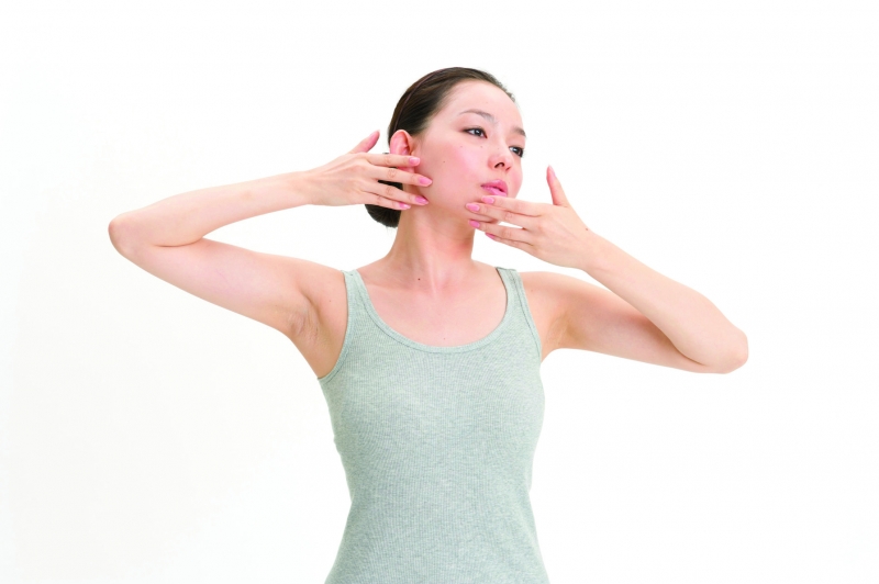 張開雙手的中指和無名指,夾住下巴骨骼和腮幫子,往上下‧左右的方向輕輕拉緊。張開手肘,讓手指和手臂呈一直線,隨時注意放鬆肩膀和手指力量。