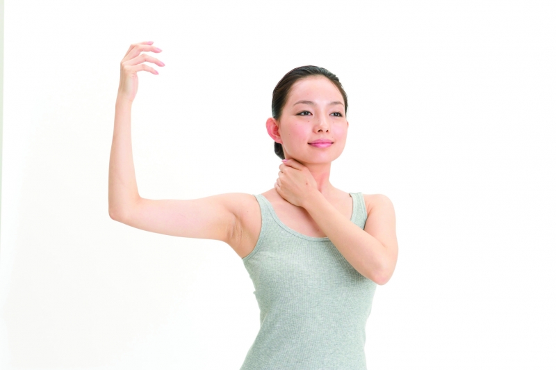 手臂無法高舉或感到疼痛時,一定要先放鬆身體正面的肌肉。請將手放在胸大肌(請參照P40),大口吐氣,完成保養後,在不感覺疼痛的範圍內慢慢嘗試。