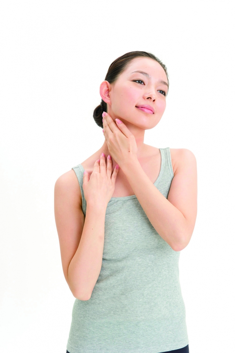 輕輕抬起下巴,放鬆肩膀和手指力量,整個手掌輕輕放在頸部側邊,緊密包覆,交互從下巴後方往鎖骨一帶輕撫。做完步驟1~5之後,另一邊重複相同動作。