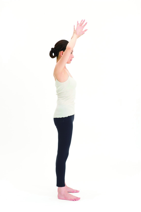 雙腳打開與腰同寬,雙手手掌朝外,高舉過頭,在正上方輕輕地上下擺動。不要活動整隻手臂,想像從手臂傳遞振動到肩膀、頸部與耳朵。嘴巴微張,下巴稍微往前突,更能提升放鬆效果。