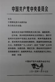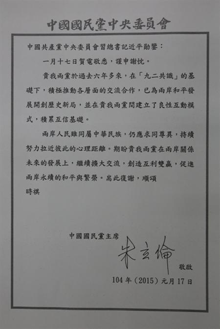 兩岸人民雖同屬中華民族,仍應求同尊異,持續拉進彼此的心理距離。期盼貴我兩黨在兩岸關係未來的發展上,繼續擴大交流,創造互利雙贏,促進兩岸永續的和平與繁榮。耑此復謝,順頌