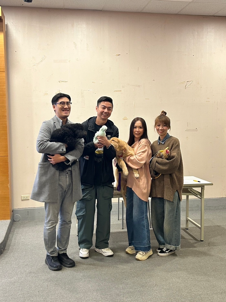 ▲ 台北海大國合長林威克(左一)盛讚熊爸(左二)寵物行為訓練很受歡迎,右為寵物系主任王宥婷、課指組組長莊雅雯。有趣的是,拍照時主任抱的狗正含著熊爸手上雞的腳,眾人笑說狗在吃雞腳凍了。(圖:台北海大)