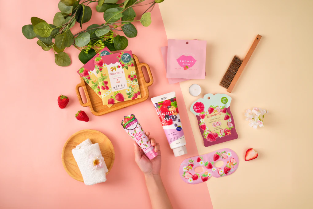以一場放鬆身心的泡澡開啟下班的序幕「CICA草莓保濕入浴劑」添加人氣保養成分積雪草萃取物,幫助肌膚潤澤保濕強化防護力,奢華的植翠草莓香氣,舒緩一天的疲倦;用眼過度的一天讓「草莓風味溫感眼罩」減少眼睛的壓力,淡淡的草莓果香,使用20分鐘還你一雙光彩奪目的雙眼;日本超人氣小資族愛用品牌Kracie推出「度假風香氛身體乳」富含天然蔬果及黑莓果粹取精華,鎖住肌膚滋潤,香甜莓果香氣,舉手投足之間散發夢幻氛氛圍;女孩必備護手霜「水果植粹護手霜」主打富含蠶絲蛋白及白山茶油精華,修復擾人乾燥問題,讓雙手持續柔滑潤澤,無須擦香水也散發迷人香氣;想要在冬季談一場刻苦銘心的戀愛,先擁有水潤嘟嘟唇,日本人氣熱銷「CHOOSY唇膜-草莓」富含多種保持成分,水潤浸透的冰涼觸感滋潤嘴唇,讓唇部更加Q彈,散發淡淡草莓香氣。