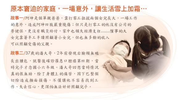 阿坤是位單親爸爸,平日靠打零工拉拔兩個女兒長大,一場工作的意外,造成阿坤四肢嚴重燒傷;但只是打零工的他沒有公司的勞健保,更沒有職災給付,家中也頓失經濟支柱,懂事的大女兒靠著半工半讀照顧著小女兒,但也無多餘的收入可以照顧受傷的父親......