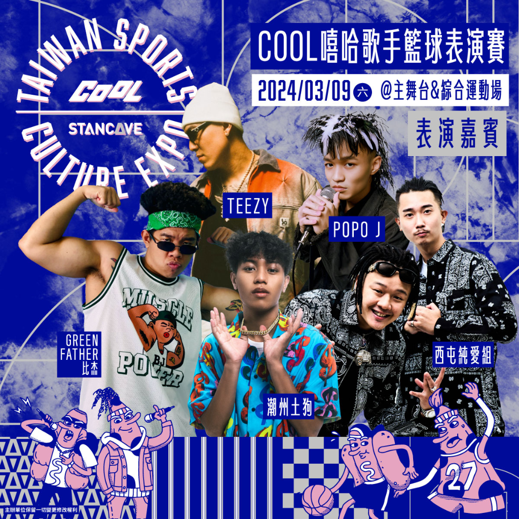 人氣嘻哈歌手串燒表演則是活動另一大亮點,將於活動主舞台展開一系列的經典嘻哈歌曲,為展會現場增添火熱動感氣氛,炸裂全場。歌手陣容包含:肌肉棒子-Green Father 比杰、來自台中的純西海岸團體-西屯純愛組、台灣警察 -POPO J、生猛饒舌新星-潮州土狗、音樂才子-Teezy。表演結束後,人氣歌手們將於綜合運動場舉辦嘻哈歌手1v1鬥牛對抗賽,打造嘻哈圈的巔峰籃球對決,讓不少好奇嘻哈歌手們籃球實力的朋友們相當期待。