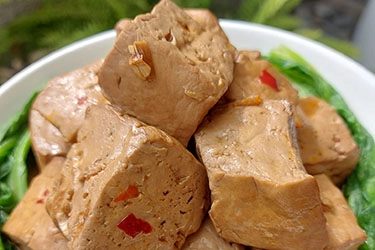做法:豆腐和油豆腐洗淨,豆腐切大塊,老薑拍扁切末。熱鍋下油爆香老薑末,放入砂糖炒小火至焦糖色熄火,加入辣豆瓣醬、醬油和素蠔油拌勻,開火炒香。加入水和五香粉煮滾,調整鹹甜度(各品牌醬油鹹度不同)。放入豆腐和油豆腐,煮滾後轉小火滷煮20分鐘。放涼移入冰箱冷藏浸泡入味,食用時蒸熱即可。