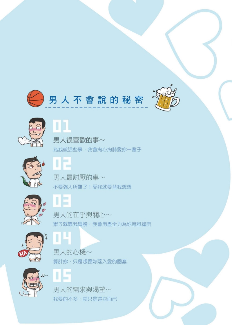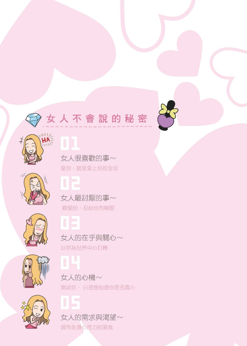 你是否正處於曖昧、熱戀,每天都為心愛的人心情起伏,像洗三溫暖,亦或是日子過得平淡無奇、了無新意,有如一杯白開水。那麼此時推薦你服用這本《男人女人不會說的祕密》包你藥到病除,立刻解決所有感情上的疑難雜症!讓你捧腹大笑、豁然開朗!