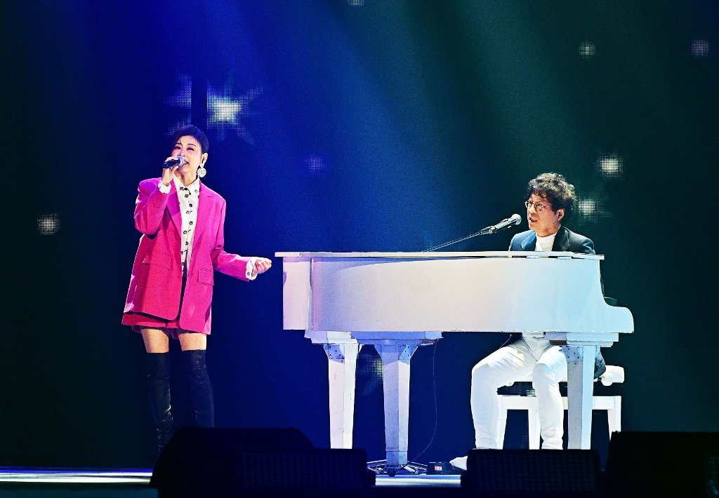 ▲ 方馨一身桃紅色套裝豔麗中有帥氣,對尬米可白低胸大紅禮服。(圖:JMS蔣三省音樂)