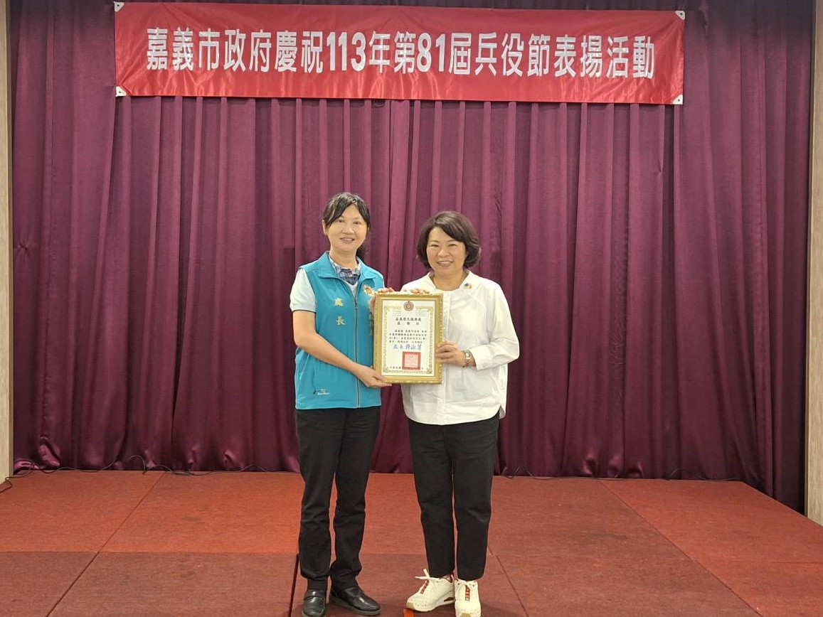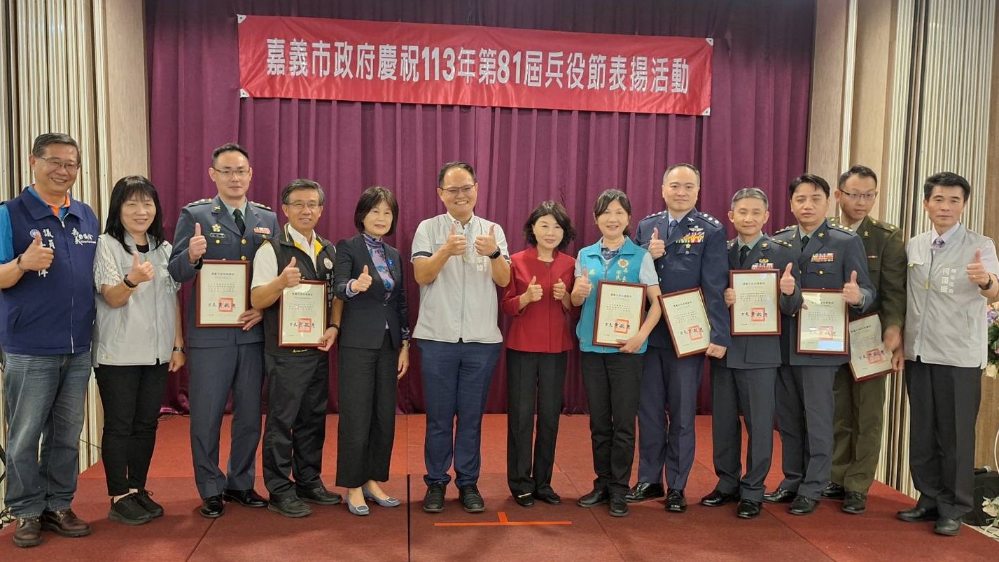 黃市長也特別頒獎表揚模範徵屬方麗芳、巫淑燕、郭一民、陳進安、吳盈燁等人,感謝家長們對於子女選擇軍職、服義務役的支持,更感謝他們對國家與嘉義市的奉獻,同時也頒獎表揚推行兵役業務有功國軍單位人員-嘉義縣市軍人服務站張勉站長;績優役政人員:民政處莊雅涵科員、東、西區區公所蔡佳君課員及張淑芬課員以及區公所9名里幹事,會中並頒發感謝狀感謝嘉義榮民服務處、嘉義縣市軍人服務站、嘉義後備指揮部、空軍第四戰術戰鬥機聯隊、陸軍南測中心、嘉義憲兵隊、陸軍257旅等國軍單位,協助嘉義市辦理防災及動員準備工作,軍民同心一起面對氣候變遷所帶來的各種挑戰。