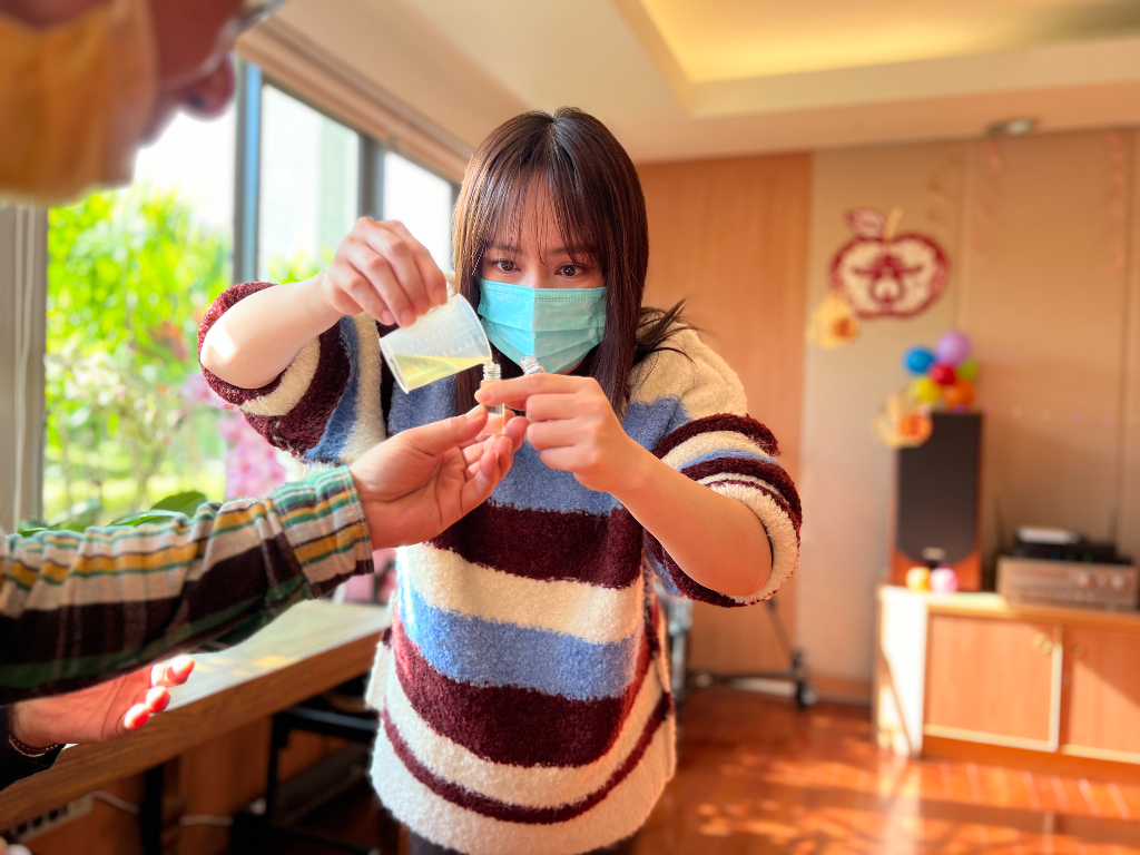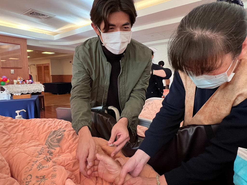 黃瀞怡(小薰)跟梁正群兩個人都是第一次到醫院當志工,黃瀞怡(小薰)是唸護校畢業,有在醫院實習過,志工要做的事對她來說還算熟能生巧,她也很喜歡跟爺爺們聊聊天。黃瀞怡(小薰)說做一日志工很有義意的是「不用覺得要做更大的事去幫助身邊的人,其實陪伴才是最難的,時間我來說非常的寶貴,願意騰出時間都勝過於一切,在龍年畫下一個蠻好的開場。」愈親近就愈會說「我很忙沒有空」,其實時間是可以擠出來,哪怕是回到家相處一點鐘頭,跟家人聊聊天吃個飯,黃瀞怡(小薰)覺得這就是最大的愛。