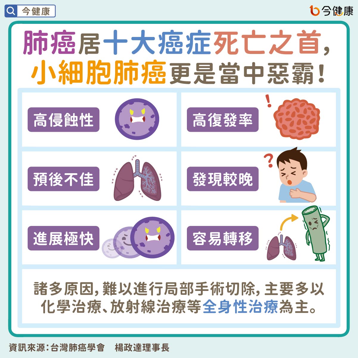 小細胞肺癌具有高侵襲性、復發率高、預後差等特性,加上多數患者發現時,已進入擴散期,以致病程進展快速,容易轉移至淋巴腺或遠端器官,難以進行局部手術切除,主要多以化學治療、放射線治療等全身性治療為主。