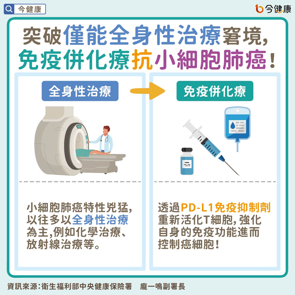 根據美國NCCN小細胞肺癌治療指引,目前擴散期的小細胞肺癌患者以PD-L1免疫抑制劑合併化療為首選治療方案,透過PD-L1免疫抑制劑重新活化T細胞,強化自身的免疫功能進而控制癌細胞。楊政達理事長指出,在研究試驗中,PD-L1免疫抑制劑合併化療相較單獨進行化療,整體存活期可延長超過一年,對於小細胞肺癌患者而言是嶄新的新里程!