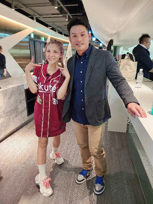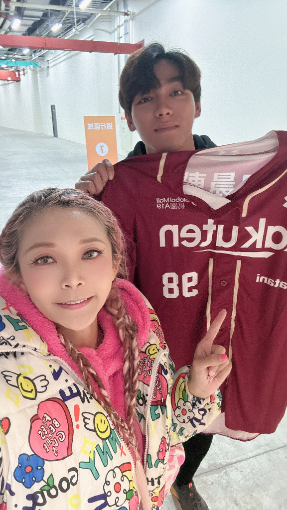 ▲ 圓圓與樂天桃猿選手陳晨威借「實戰」球衣求大巨蛋首秀一切順利。(圖:DJ圓圓)