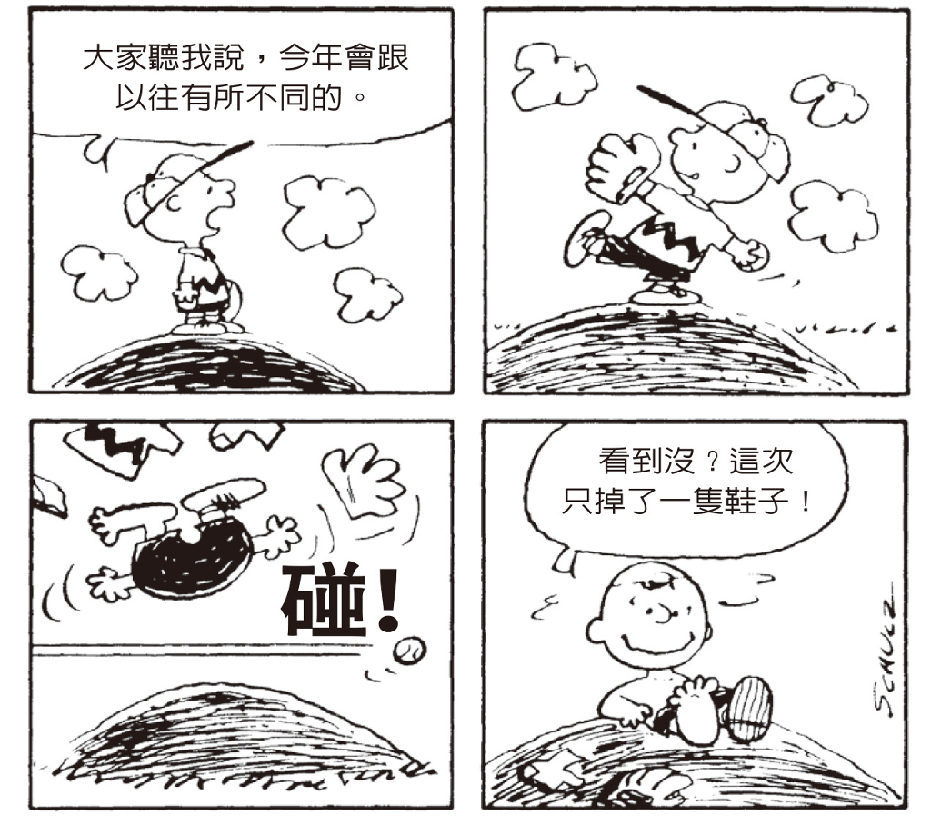 《花生》漫畫每一季的開頭,查理布朗都會在嘗試踢飛橄欖球時摔個四腳朝天。每年他都會合理解釋今年如何與以往不同,保證自己不會失腳。但每一年,同樣的事都會再次發生。查理布朗並沒有從過往的經驗中學習。他每每全力以赴,而且總是用盡全身力氣地去踢那顆橄欖球。只是結果不盡人意而已。