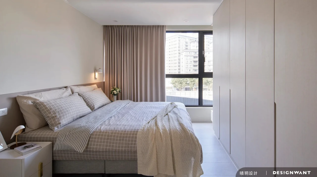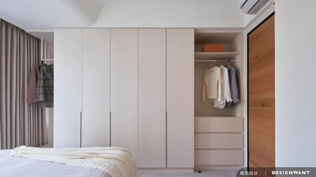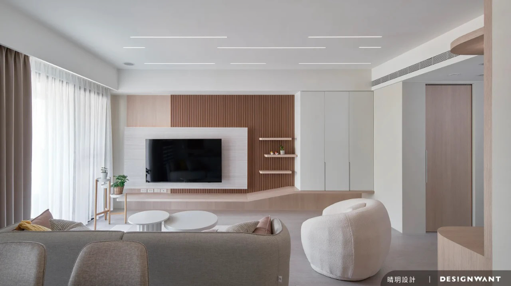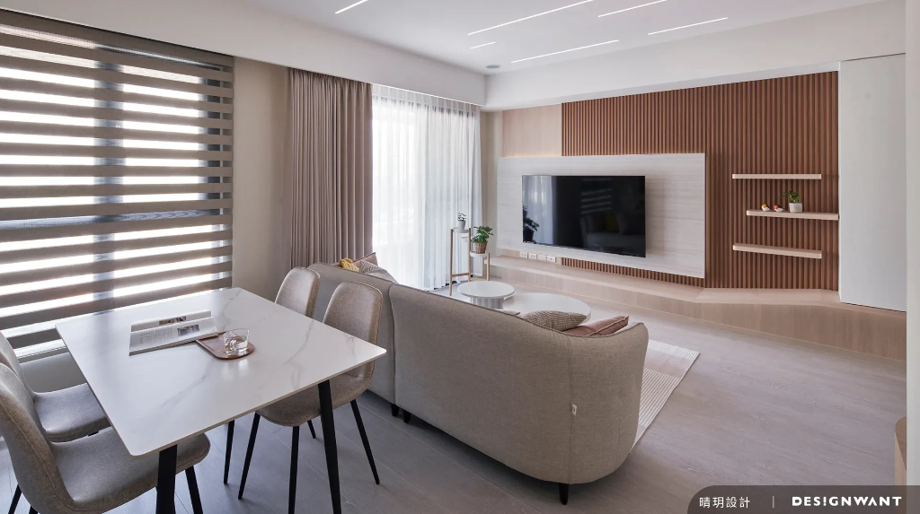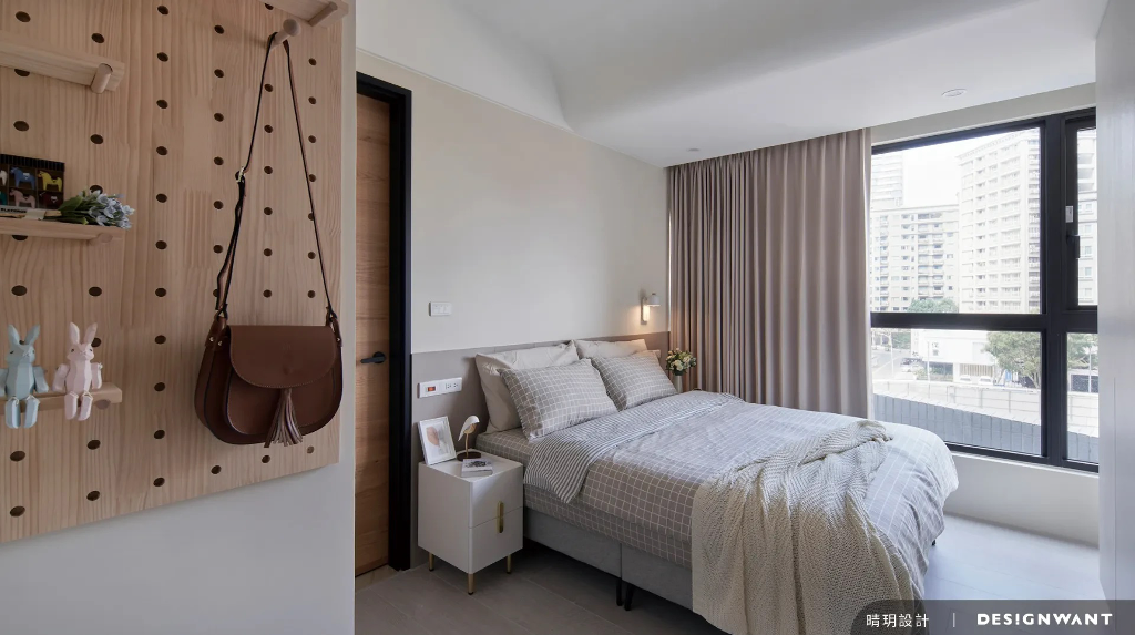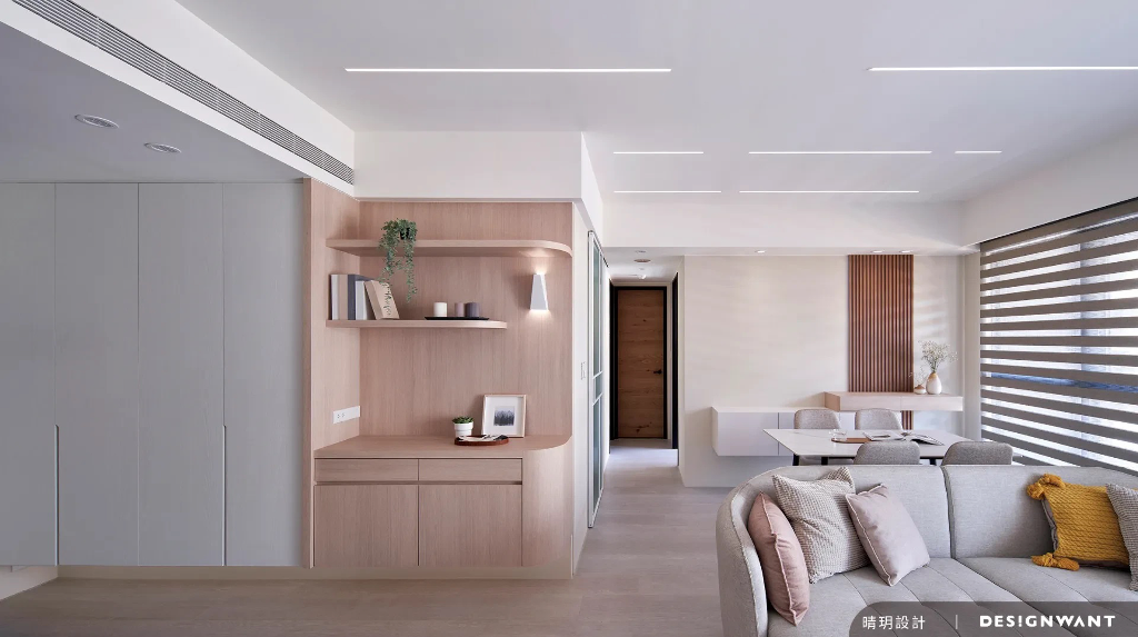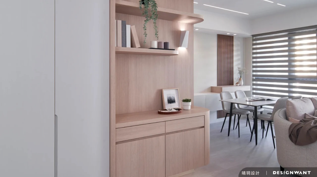基地為新成屋,空間使用人口為一對母女,喜好出國遊玩的她們總會收藏旅行中的回憶,像是畫作、酒瓶等,因此對於空間的想像是在足夠的收納條件下,擁有舒心溫暖的元素,設計端基於此安排日式無印風,以木質調的溫潤質地與格柵的縱橫線條,描繪出屬於她們生活的完美藍圖。