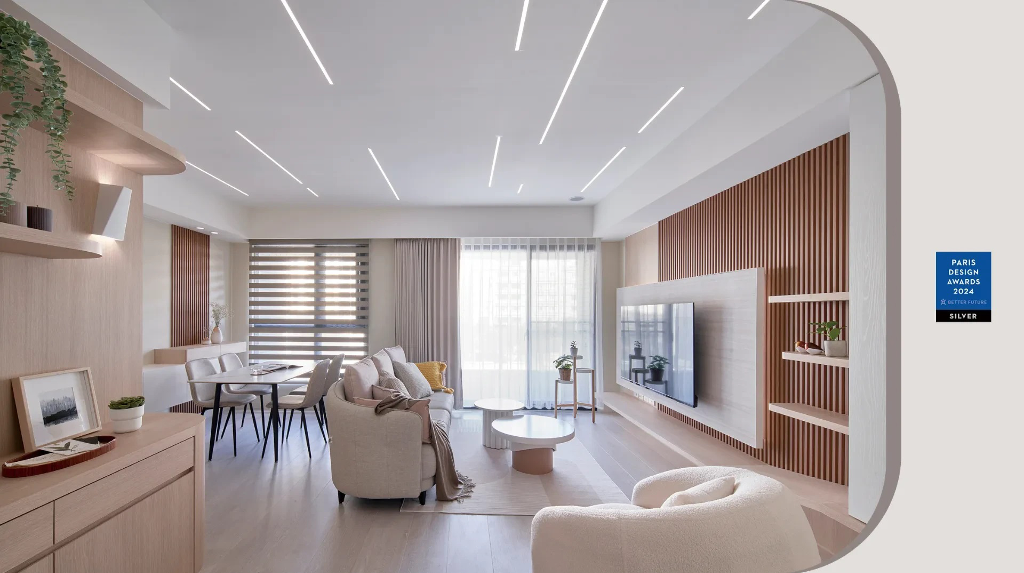 作品以線條元素成為現代風格的靈感泉源,透過天花板上的細線條燈具,營造出簡潔明亮的照明效果,不規則的線條穿插其中凸顯出環境的藝術感受,並且可以讓光線擁有流動性,獨特的光影效果在提供功能性的照明時,也能增添空間的幾何美感。