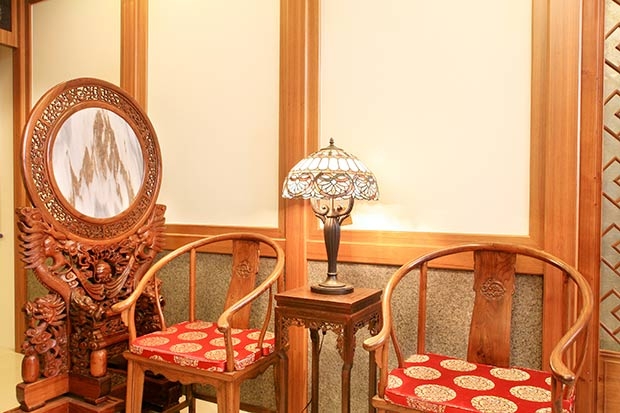 3.【圖說】兩側擺設對稱形式的太師椅,以及鑲貼圓形大理石的造型屏風座,古韻綿綿。