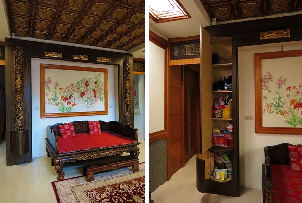 4.【圖說】羅漢床榻背立面框架,以金漆立體雕飾的假柱,實為收納格櫃。