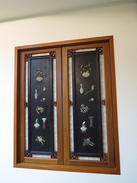 5.【圖說】四人房瀟湘閣外廳,兩扇窗戶均運用現代工法,將古飾片融入,精製成可夾入牆中的硬式窗簾。