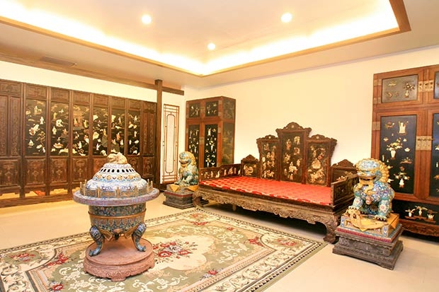 7.【圖說】床榻安裝九屏式床圍,床腳形式為內翻馬蹄足,周邊擺設景泰藍香爐及獅子,百寶嵌家具、屏風等。