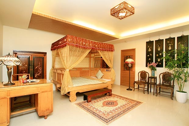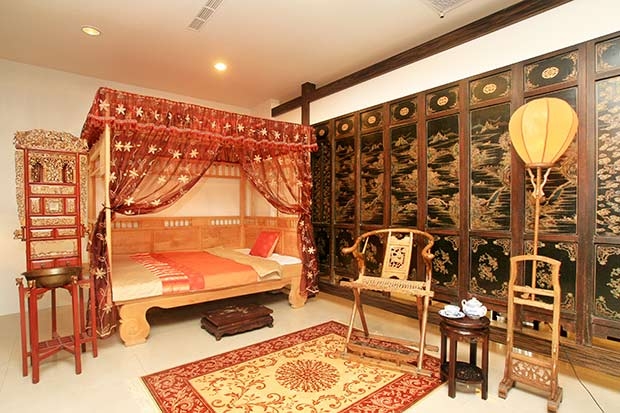 一樓公共空間以中式古風為陳設主軸,局部挑高營造大器風範。家具以羅漢床榻、太師椅、屏風、窗花等聚焦濃厚中式氣氛,擺設則以斑斕奪目的景泰藍居多。房間以榫接古法精製的全新八腳床,舒適地讓人產生幻覺,猶如跟骨董來上一夜情!