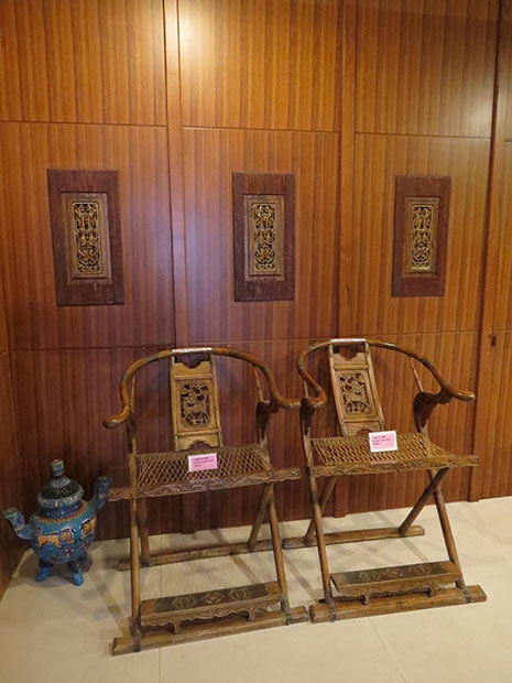9.【圖說】冬山河人文會館在房內裝飾木作立面隱藏現代衛浴間,前方展示仿古太師折疊椅。