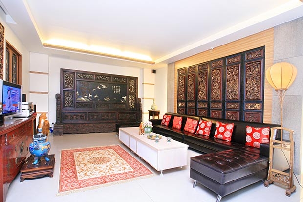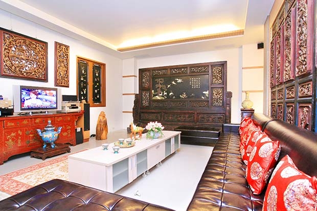 12.【圖說】位於一樓的交誼廳,以現代沙發及茶几,搭配古窗花背牆,展現中西交融美感。