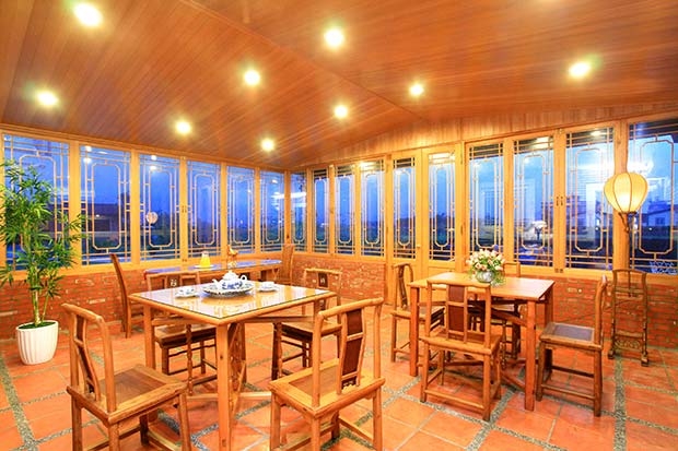 14.【圖說】餐廳以清水磚鋪設地坪,清玻璃裝飾古典線條窗,講究的仿古家具,宛如玻璃屋客棧。