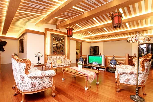 1.【圖說】天花採用越南檜木散發淡香,間接光源點綴紅燈籠,與歐式沙發形塑中西交會的古典氛圍。