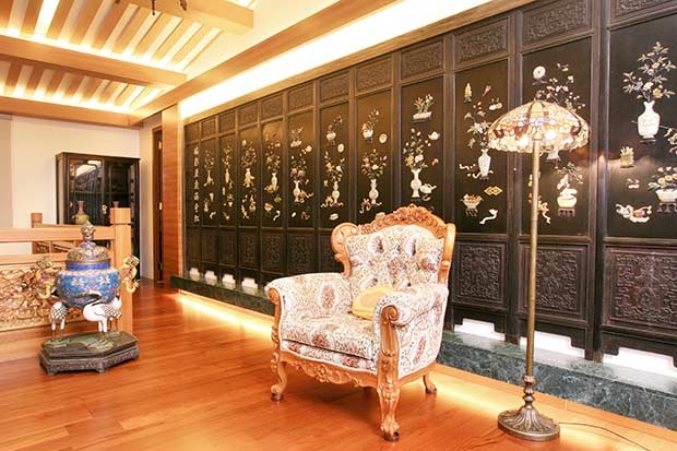2.【圖說】延續一樓古風,有如立體浮雕畫的百寶嵌隔屏,由大理石地檯與燈光烘托,光彩奪目。