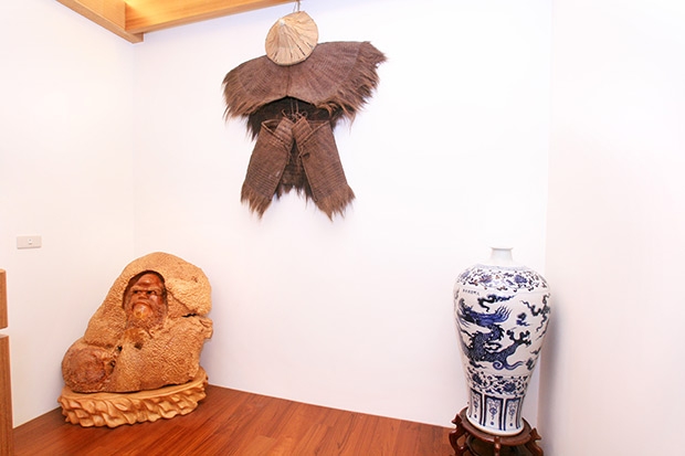 5.【圖說】空間裡隨意擺放民俗藝品,以樹瘤雕刻的鍾馗、農家蓑衣、青花瓷等。