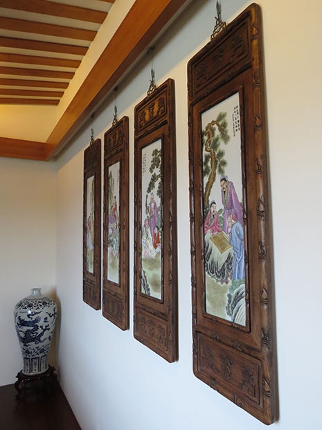 值得細細品味的空間陳設,由12幅屏風修飾的牆面,氣宇非凡。將螺鈿、牙角、琥珀、玉石等素材雕刻成具象人物、花卉,鑲嵌於漆器或家具上,是古代皇宮貴族盛行的百寶嵌裝飾,除裝設於一樓的八仙過海,二樓處以花卉器物為內容,展現雅俗共賞的生活形貌。
