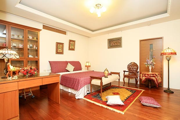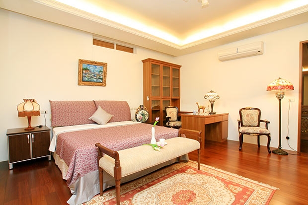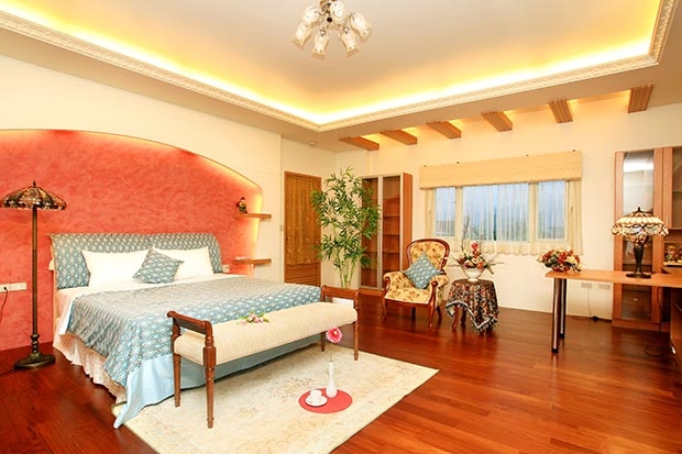 有別於清宮劇場景鋪排,走出歷史味的二樓房間,呼應交誼廳的歐風混搭特色,以淡雅的歐式延續私密空間主題,藉由家具線條及彩色鑲嵌玻璃燈妝點,凝聚溫馨舒適的休憩場域。