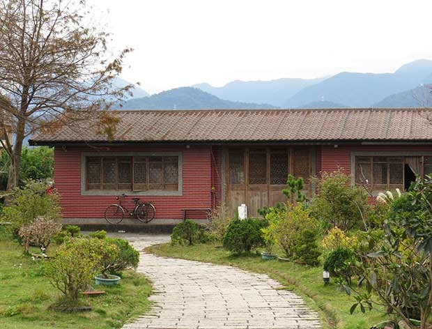 13.【圖說】遠山襯著稻香館紅磚搭配花窗,還有老爺式腳踏車,散發濃濃復古風。