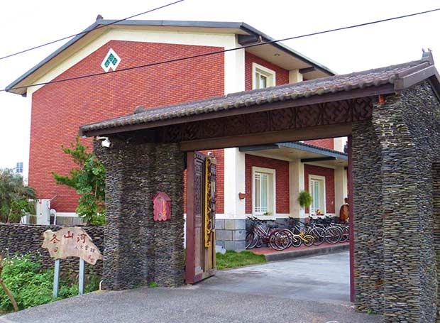15.【圖說】使用鵝卵石堆砌的庭院門柱,由劉爸爸以檜木雕刻的招牌,樸拙可愛,門前腳踏車免費供騎乘。