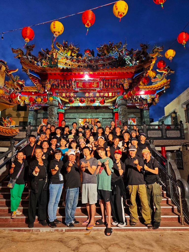 ▲ 《看到靈魂的那隻眼 師公》在澎湖海靈殿前拍攝大合照,右上角屋簷疑似出現王爺的臉,讓大家嘖嘖稱奇。(圖:鳳凰藝能提供)