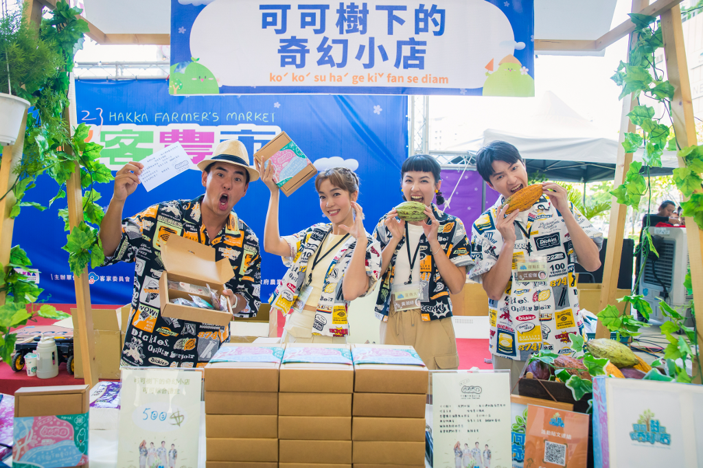 ▲ (左起)柯有倫、大霈、黃湘婷、江宏傑前進客家博覽會銷售自製禮盒。(圖:客家電視)