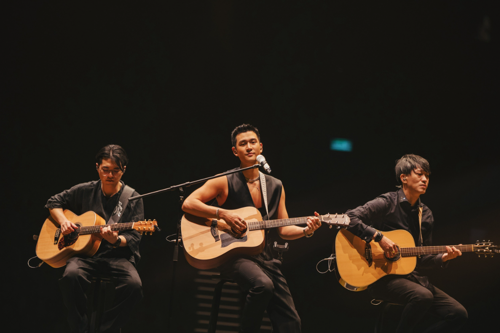 ▲ 身穿黑色無袖皮背心的周興哲,其實已展露出精壯的臂膀,演出吉他段落的抒情時刻,粉絲不約而同大敲碗「脫掉」。(圖:星空飛騰)