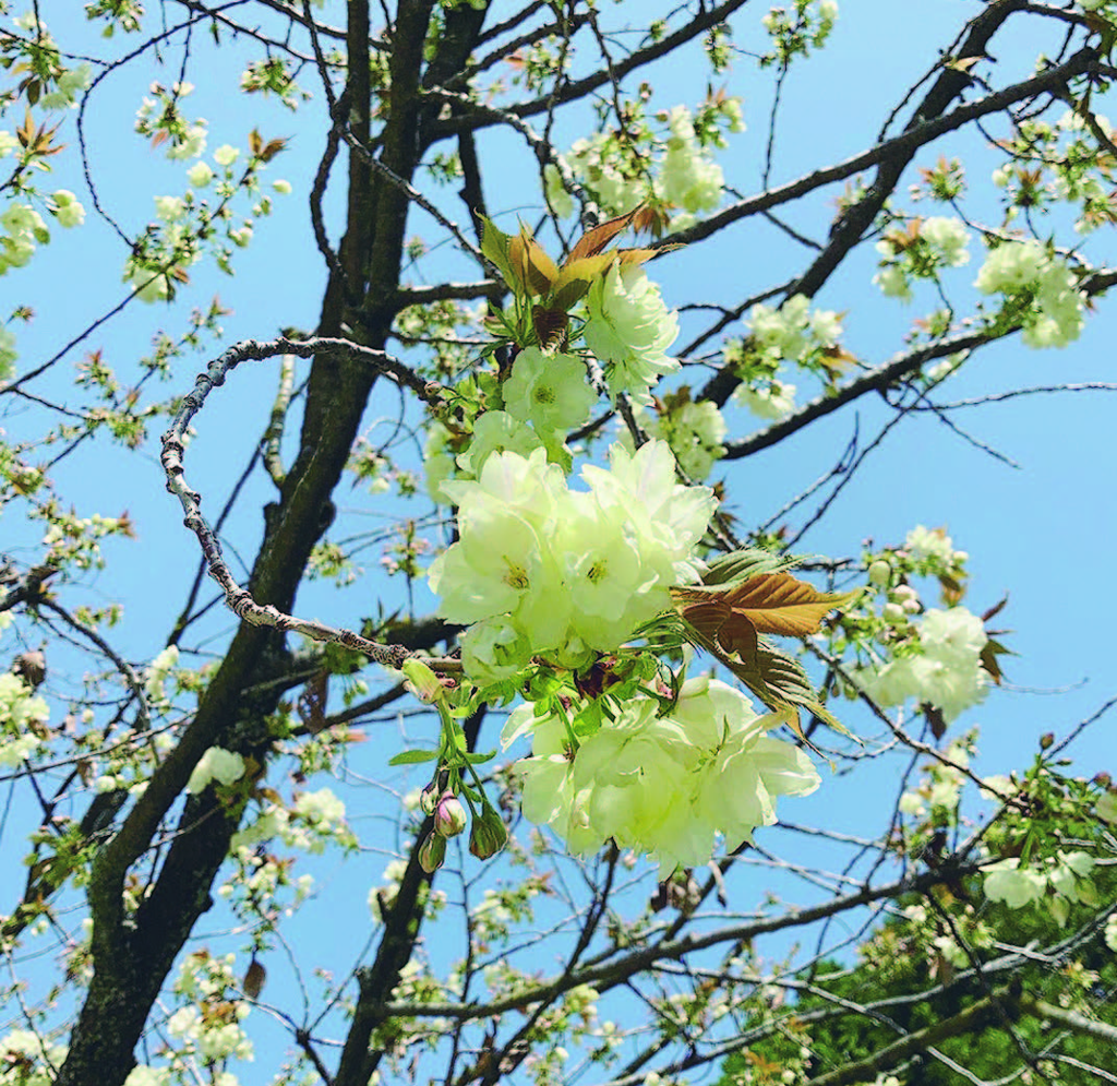 首次見到黃綠色的櫻花「御衣黃」就是在京都。這是在與庭園設計師烏賀陽百合散步時,她指給我看的。「御衣」意指貴族的和服,其綠色花瓣與平安時代的貴族服裝「萌黃色」相似,而成為命名由來。據說是來自大島櫻的日本原生培育品種。