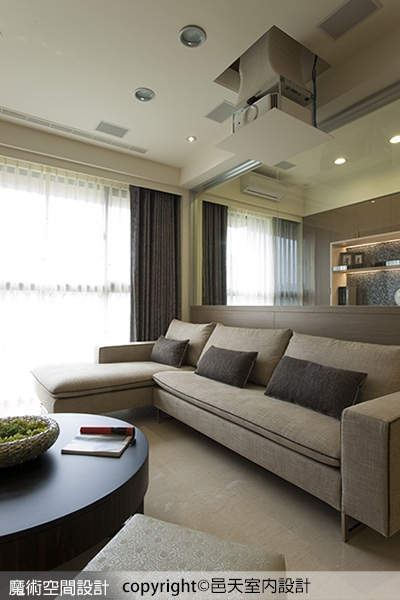 (5)【圖說】在客廳區打造專屬的家庭劇院,規劃升降式的投影機,維持天花的高度及俐落感受。