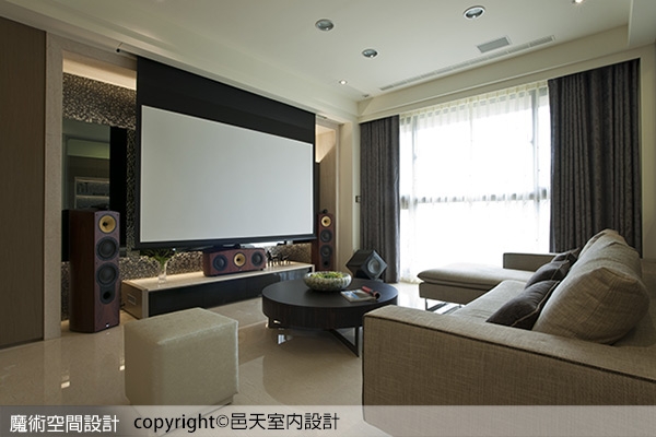 (6)【圖說】邑天室內設計陳建泰、鄭珊怡設計師在客廳規劃投影機及100吋布幕隱身於天花板內兼具實用與美觀,遮光效果更不容馬虎。