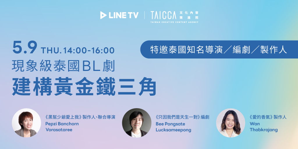 LINE TV與文化內容策進院共同合作《Be Love,Go Love -華語原創影集開發計畫》,繼去年邀請韓腐天花板《語意錯誤》主創來台分享,今年再邀請知名泰國BL劇主創於5月9日來台授課,「現象級泰國BL劇- 建構黃金鐵三角」活動即日起開始報名。