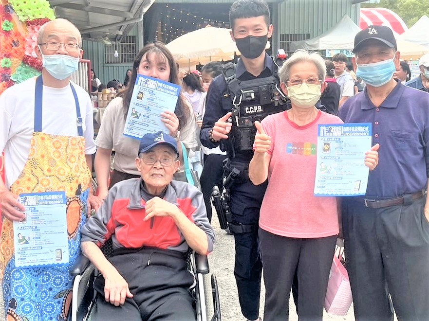 熱鬧的市集活動中,員警藉由手持便於理解的識詐圖文向現場參加長者、民眾們加強進行講解宣導,告知社區安全工作不能僅限於警察,而是要民眾與警察在互動過程中共同體認與分擔,犯罪不僅損害個人和整個家庭,也進而影響社區整體的安定與發展,同時馬里長也非常感謝八掌派出所員警們參與市集活動,向民眾宣導強化犯罪預防的觀念避免有被害的機會,現場警民互動熱絡氣氛熱鬧非凡,更是歡笑不斷地比出大讚和員警拍照合影。